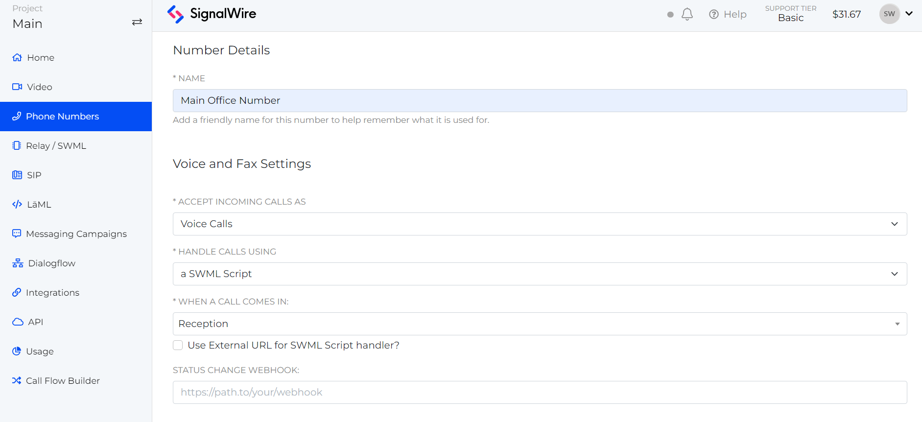 We can match up each of our SignalWire phone numbers with the Call Flow or Script we would like to use. For a phone number that you would like to handle incoming Voice calls, go to that number's settings in your Phone Numbers tab on the Dashboard.